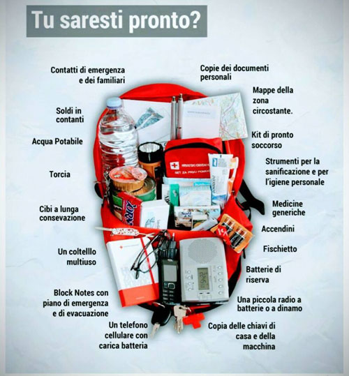 In caso di emergenza (terremoto o alluvione), non dobbiamo farci trovare impreparati. Ma bisogna essere pronti a lasciare subito la casa in pochissimi secondi e con tutto il materiale sufficiente di cui necessiteremo dopo l’accaduto. Le cose che ci serviranno nelle ore seguenti non sono poche e per questo potremo anticiparci preparando uno zaino d’emergenza. La commissione Europea, prendendo spunto delle indicazioni della FEMA (agenzia federale Americana della protezione civile) ha pubblicato una semplice infografica in collaborazione con la FEDERAZIONE INTERNAZIONALE DELLA CROCE ROSSA che tiene conto delle 20 cose di cui avremmo bisogno nelle ore seguenti, e ci invita a preparare uno zaino contenente tutto quello che ci occorre e di tenerlo in un punto facilmente raggiungibile prima di evacuare l’abitazione. Noi vi consigliamo di tenerlo in un punto verso la porta di uscita.
